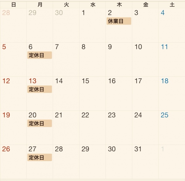 10月は2日(木)、6日(月)、13日(月)、20日(月)、27日(月)がお休みになります。